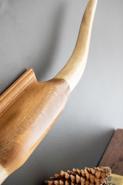 carved mango wood longhorn wall art Pinit SKU: NCRE1012 Sign in DescriptionHorns up! Bring a little Texas to your ranch or home with this carved mango wood longhorns wall art. Place one at camp or in the office year-round.Dimensions30" x 4.75" x 6"tDetails841628126419