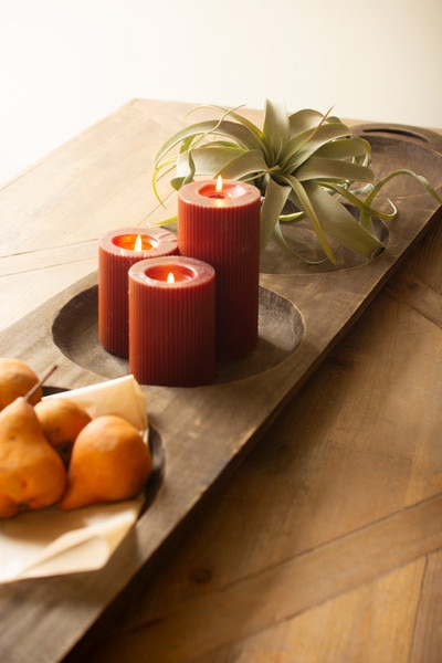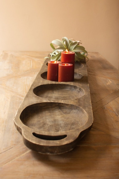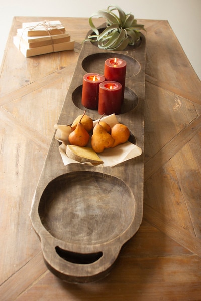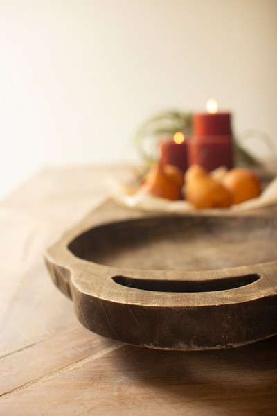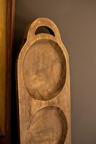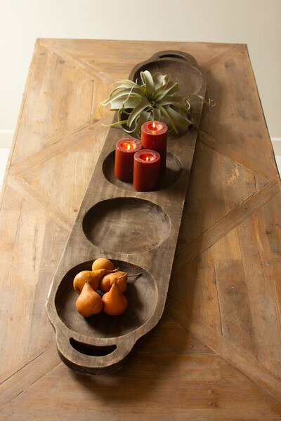 This long oval wood tray is more than a serving piece. Its smooth, elongated form and rich dark finish give it a sculptural quality that instantly draws the eye. The organic curve of the wood creates a bold, artistic presence on any table or countertop. Styled with fruit, seasonal greens, or left completely unadorned, it stands on its own as a striking statement piece that brings warmth and natural beauty to your home.