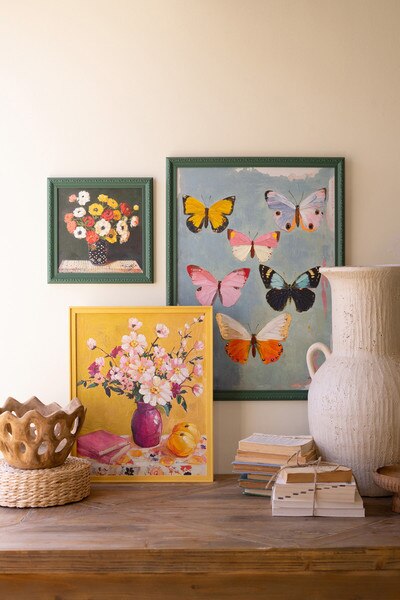 Six butterflies flit across this framed painting. Add this gem to a girl's room or a creative space to set the imagination free. This artwork features textured paint and is framed for hanging.