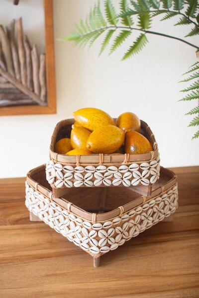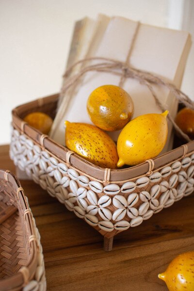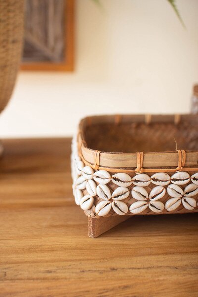 These bamboo trays showcase woven texture and delicate shell accents along the rim. Their natural materials bring a breezy, coastal feel to serving or styling. Perfect for coffee tables, vanities, or bedside organization.