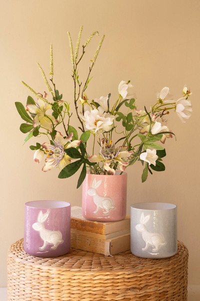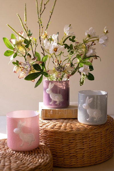 Sweet, whimsical touches for spring or year-round cheer. These colored glass bunny vases feature charming silhouettes and soft translucent tones that glow beautifully in sunlight. Perfect for single blooms, small stems, or displaying as playful decorative accents on shelves and windowsills.