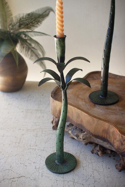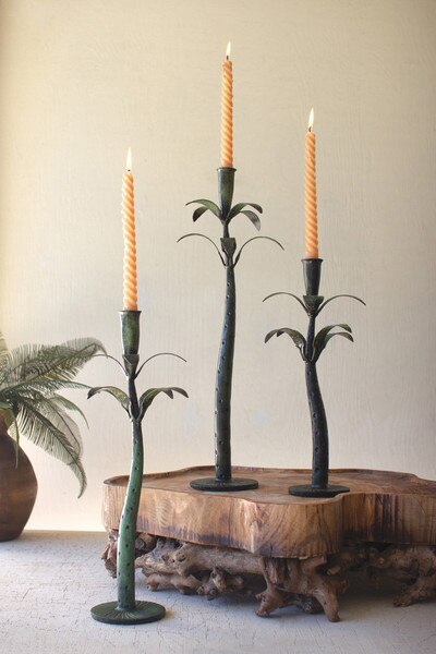 Place this set of three iron palms on your tropical table or mantle. These hold one taper candle each. The set contains three pieces with felt bottoms, one in each size.