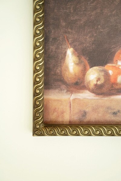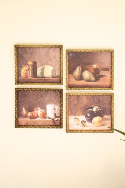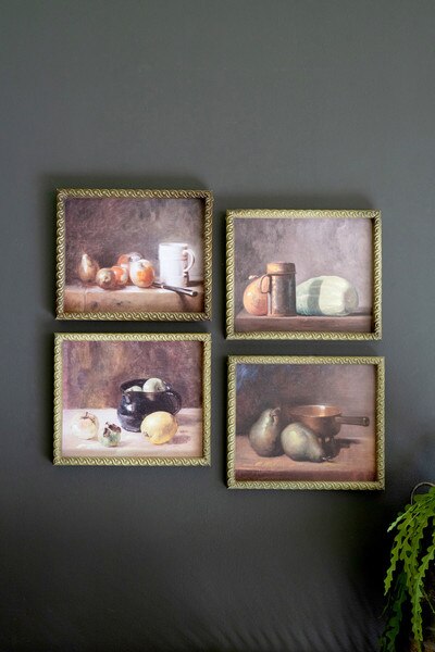 This set of four still-life prints features food and beverages in antique gold frames. Use these in the kitchen or as a housewarming gift. Each print measures 10.5" by 12.5" and comes with two D-ring hangers.