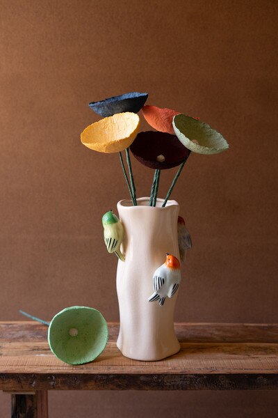 Pick this set of six paper mache flowers in one of each color. This style #3 has wide blossoms. Use them as a bouquet or separate them for vase toppers throughout your home.